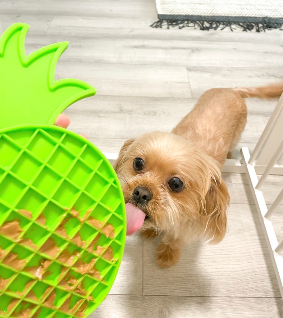 Meet the Lickit Buddy Relax: a slow feeder mat made of food-grade silicone with suction cups all along on the back so you can stick it to most surfaces. I love peanut butter, so mom smeared some on to the lick mat for me to enjoy! This was the perfect distraction while I had my paws soaking in a medicated bath and wasn’t allowed to move for 5 minutes. There’s no other way I would’ve lasted that long on my own! Before I knew it, my paw soak was done and there was nothing to be anxious about!